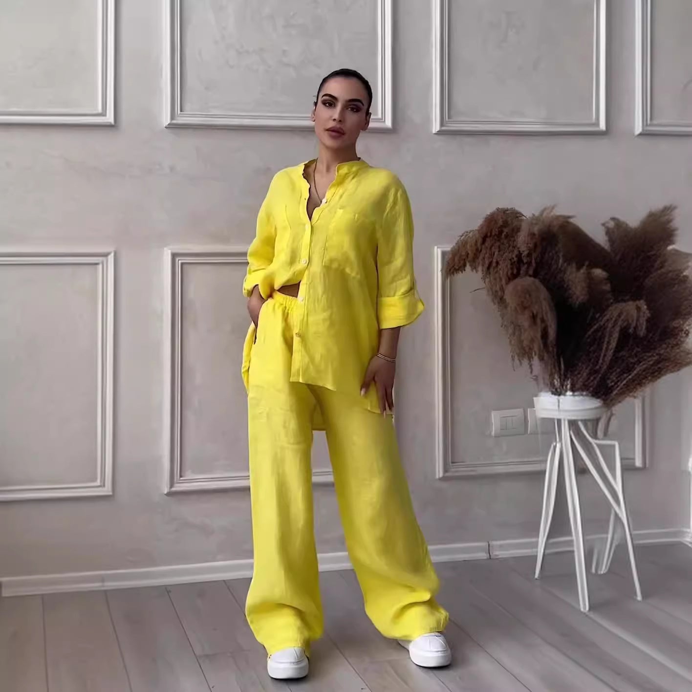 Przekształć swoją codzienną garderobę dzięki Olsen & Olsen's bezproblemowemu, stylowemu zestawowi. Wykonany z luksusowej mieszanki bawełny i lnu, ten dwuczęściowy zestaw emanuje swobodnym wyrafinowaniem, zapewniając komfort i styl na co dzień.