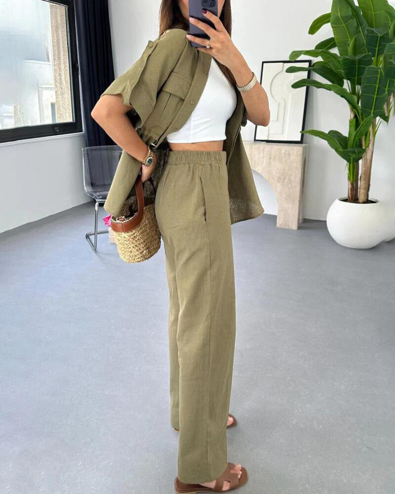 Odkryj styl i komfort z Donna™ Elegancki 2-częściowy zestaw od Olsen & Olsen! Ten zestaw łączy w sobie spodnie i krótki top, co czyni go idealnym zarówno na co dzień, jak i do pracy.