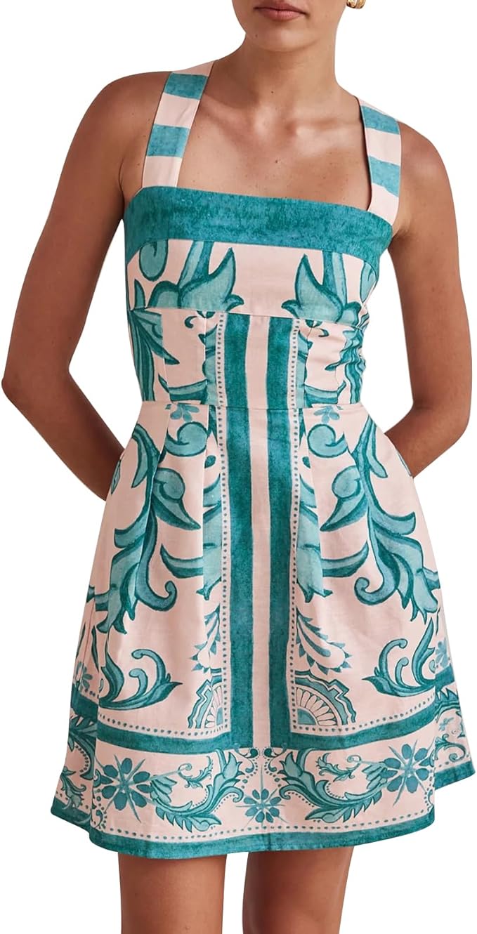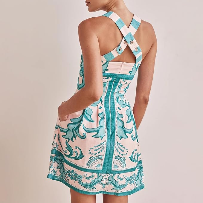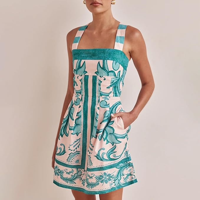 Ta artystyczna, skrojona minisukienka łączy wyrazisty, rzemieślniczy nadruk z pięknie zdefiniowaną formą. Szerokie, strukturalne ramiączka podkreślają kwadratowy dekolt, dodając elegancji i pewności siebie, a profilowane panele subtelnie modelują sylwetkę. Prawdziwa przyciągająca wzrok kreacja – stworzona, by zachwycać od spokojnych poranków po plany na złotą godzinę.
