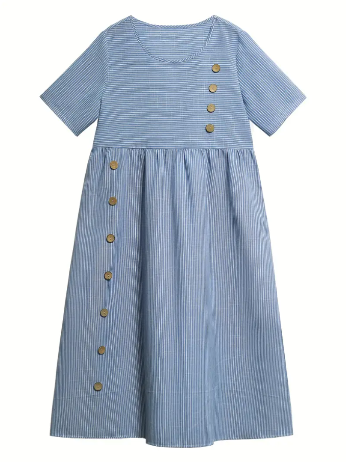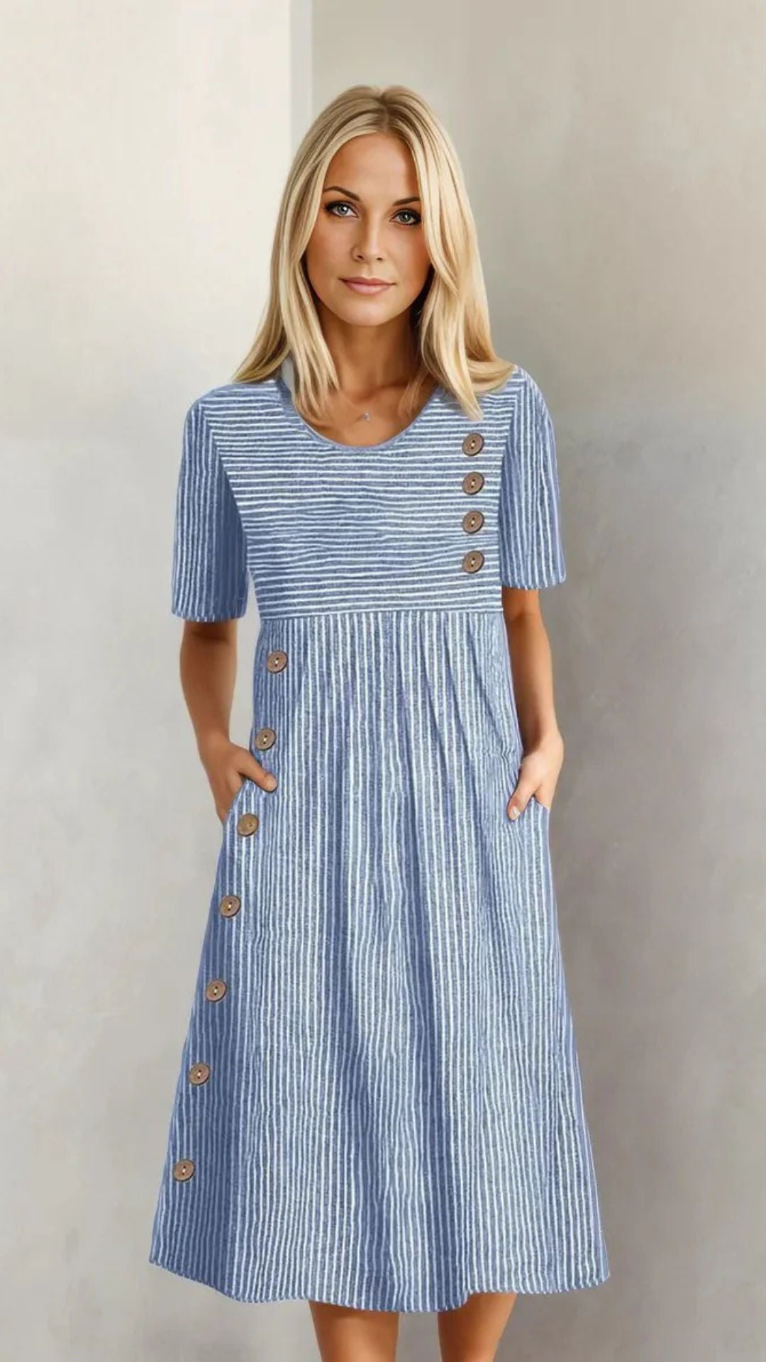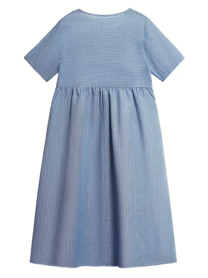 Ta pochlebna sukienka midi łączy w sobie lekki komfort materiału z sylwetką zaprojektowaną tak, aby wysubtelnić sylwetkę i delikatnie zakryć brzuszek. Ponadczasowy wzór w paski dodaje odświeżająco klasycznego charakteru, a luźne rękawy 3/4 zapewniają przewiewną wszechstronność. Długość midi gwarantuje piękne krycie i idealną równowagę, idealną na upalne dni, kiedy chcesz czuć się elegancko i wygodnie. Idealna na codzienne wyjścia, weekendowe targi lub niezobowiązujący brunch.