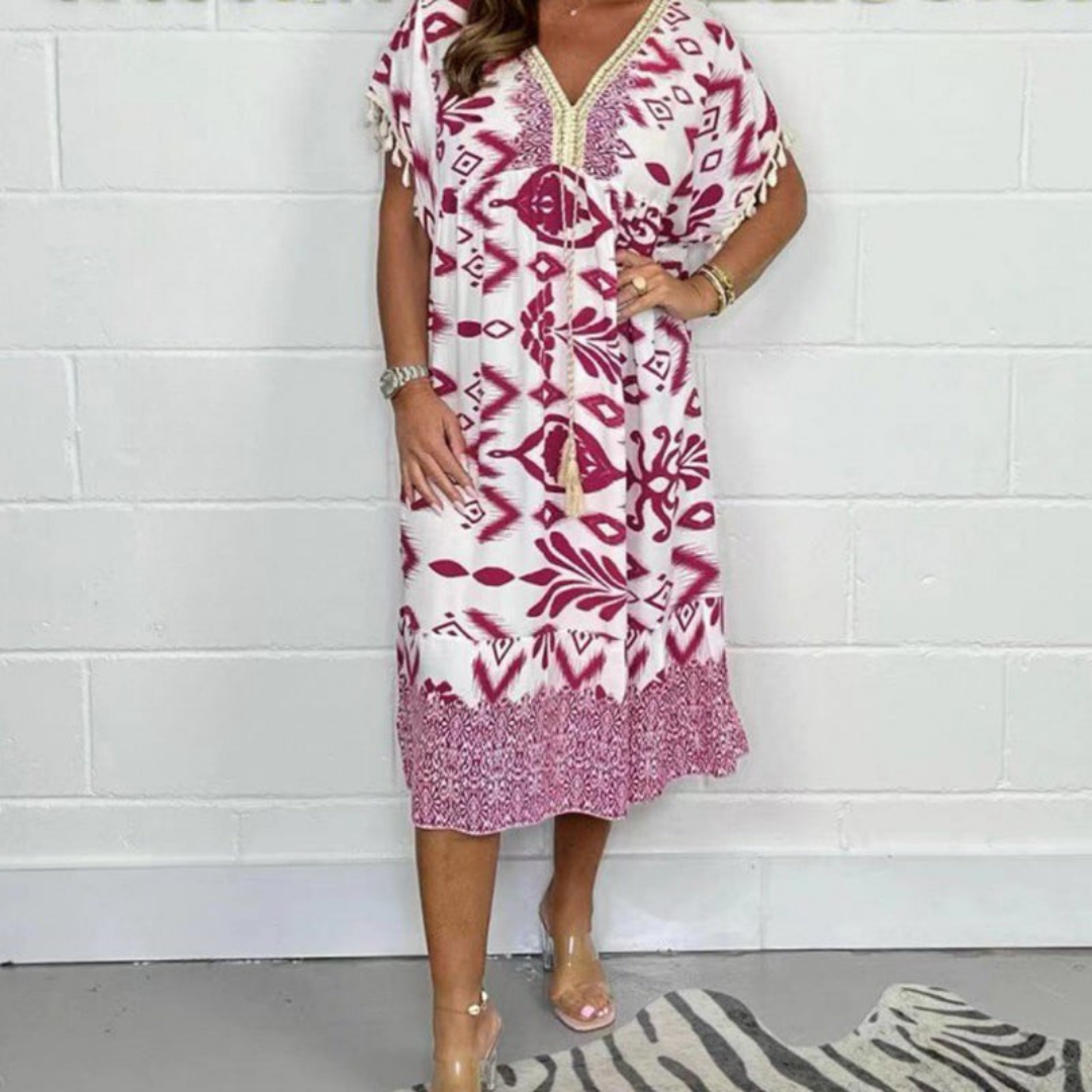 Ta drukowana sukienka zachwyca przyciągającym wzrok nadrukiem, eleganckim dekoltem w kształcie litery V oraz uroczymi rękawami ozdobionymi frędzlami.